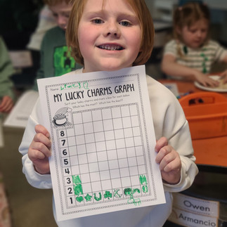 On Tuesday, we celebrated St. Patricks Day. There was so much green in our classroom. Way to go, Kindergarten, for dressing up. We gave ourselves silly leprechaun names for the day and some of them were extra hilarious! We became scientists and watched our Walking Rainbow. We used three cups of color and watched as they slowly made all the colors of the rainbow. First, we made predictions, and then we checked on our rainbow during the day. We also played a fun game where a sneaky leprechaun took items from our tray and we had to guess what was missing. We sorted and graphed Lucky Charms and talked about our favorite marshmallows.